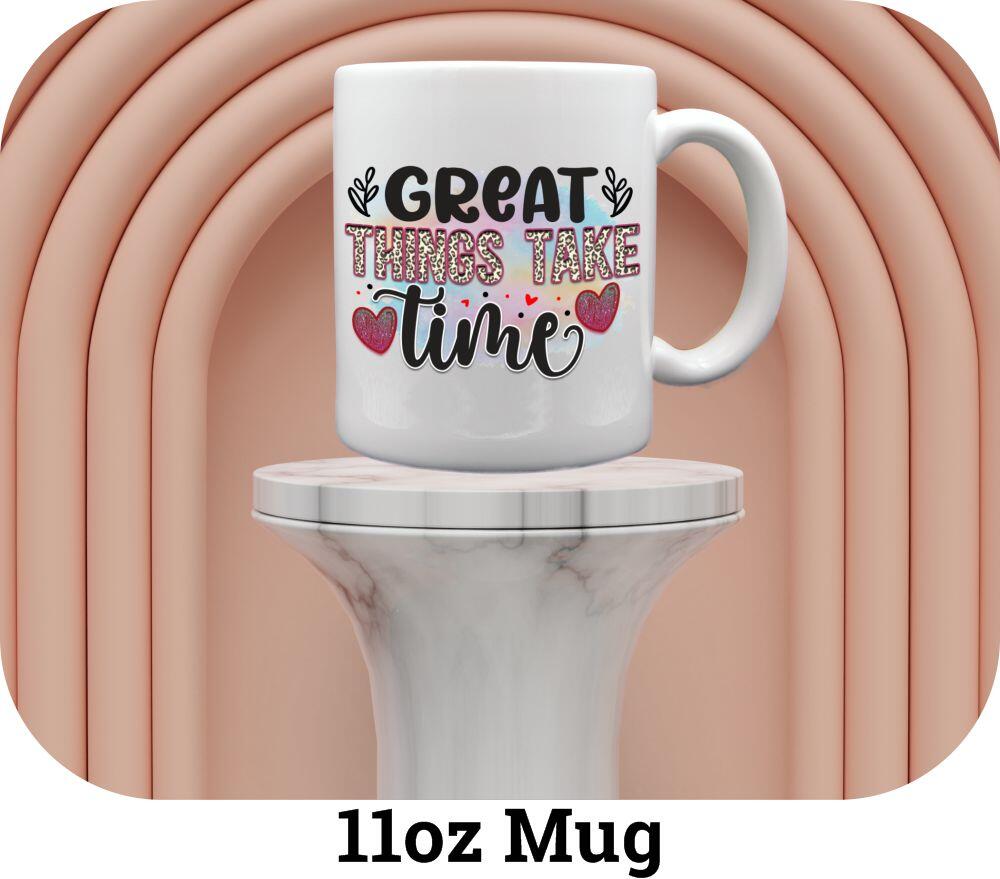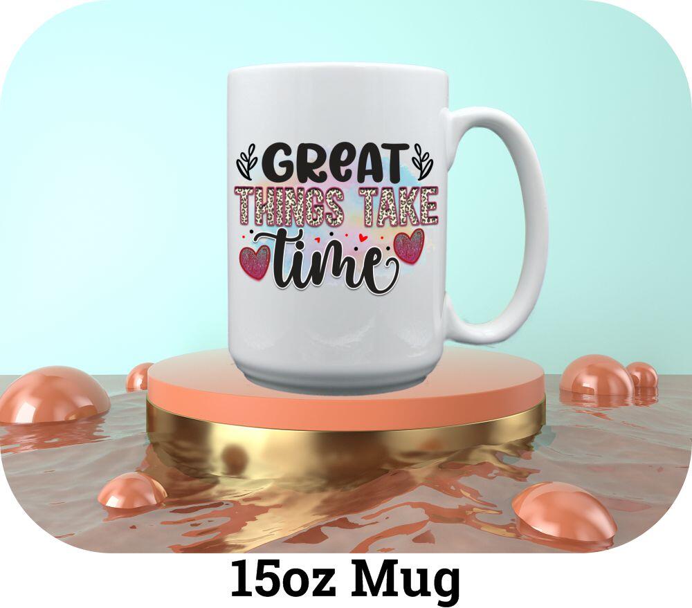 This motivational coffee mug is great for those who need a daily reminder that great things take time. This 11 or 15 ounce coffee mug says it all: “Great Things Take Time”. It makes a great gift for any occasion or simply for yourself. This mug is made of durable ceramic and is dishwasher and microwave safe.