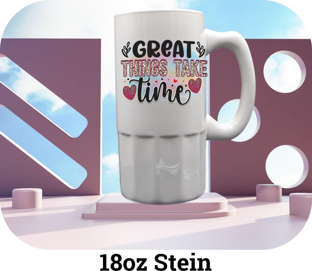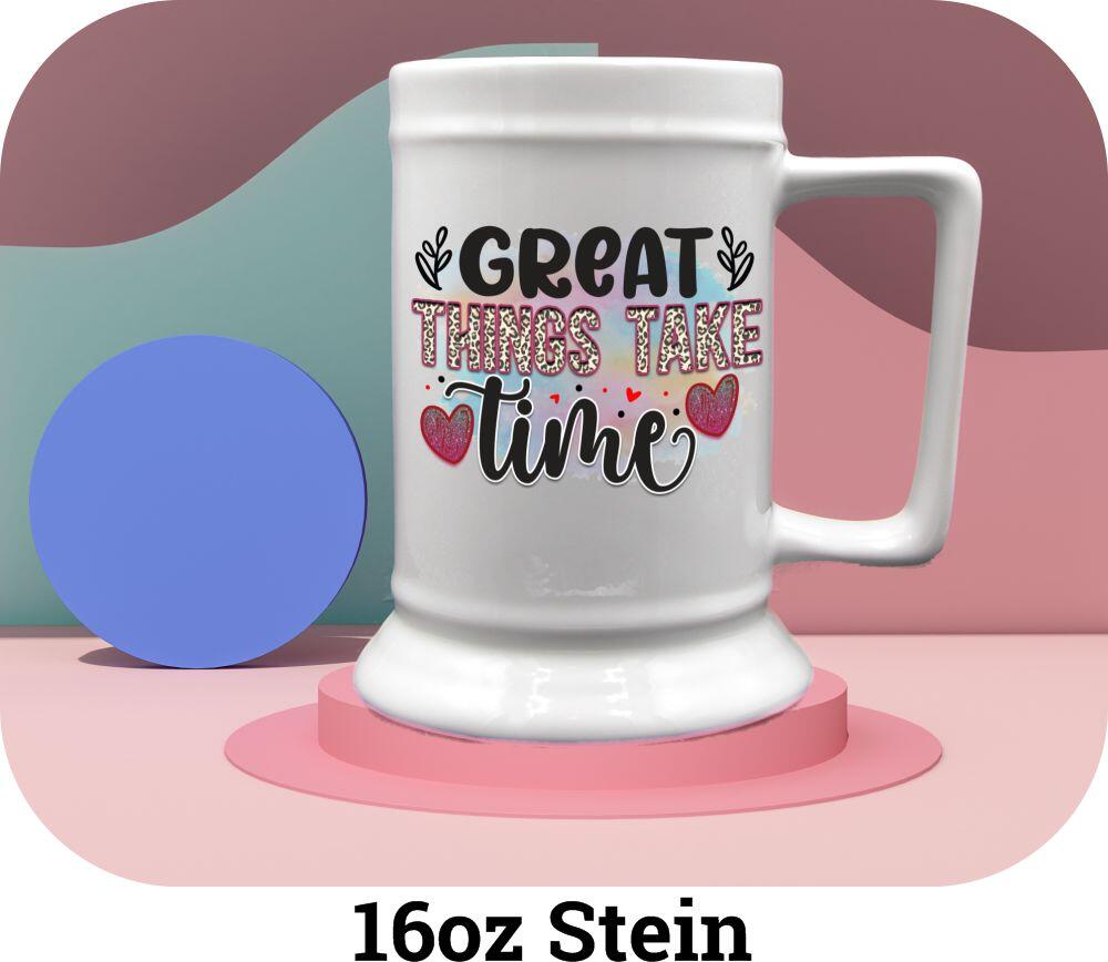 For those who appreciate the time it takes to achieve greatness, our Great Things Take Time mug and beer steins are the perfect reminder. Enjoy sipping your favorite drinks in style and celebrating your moments of success.