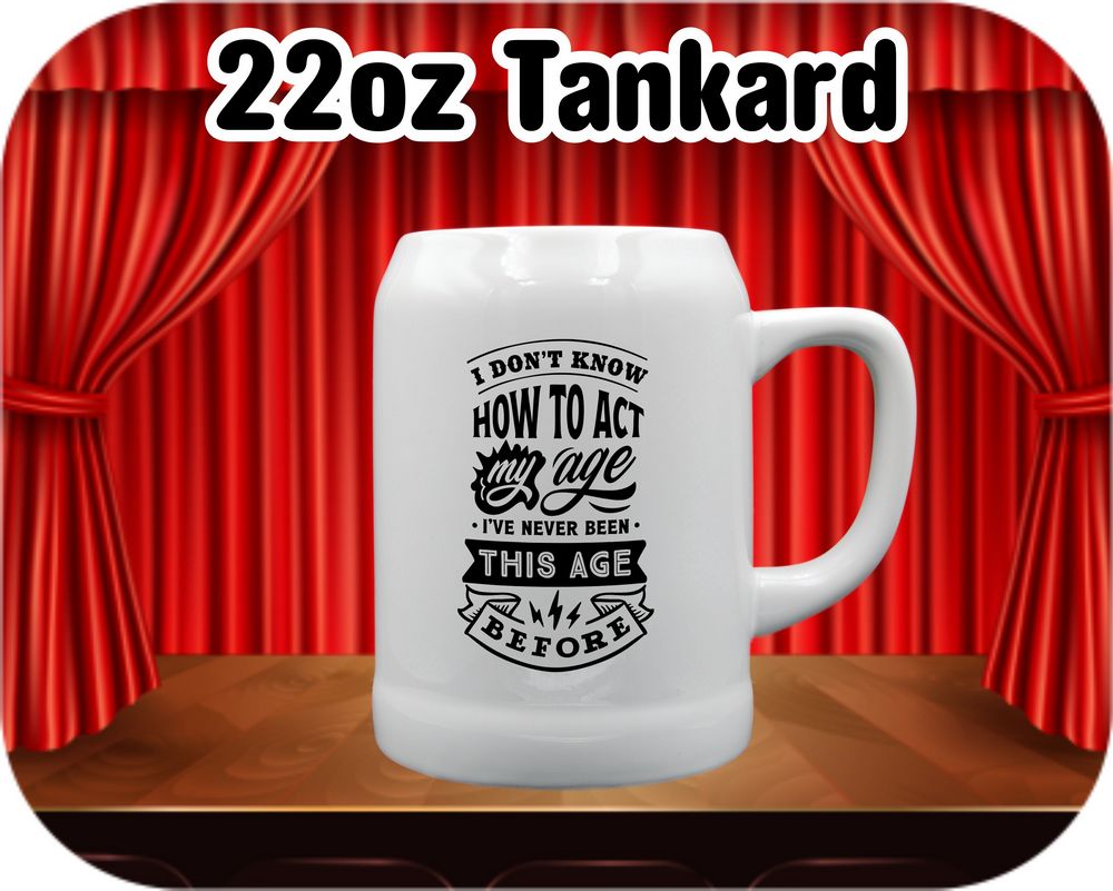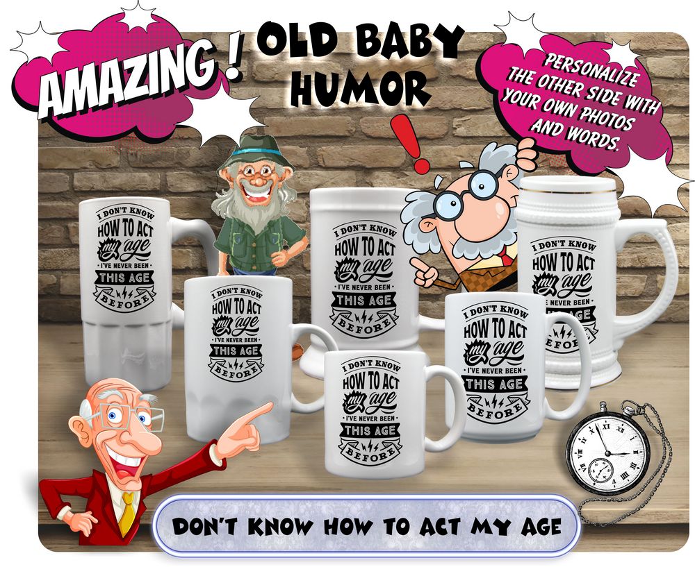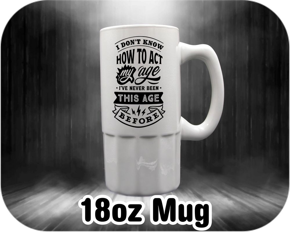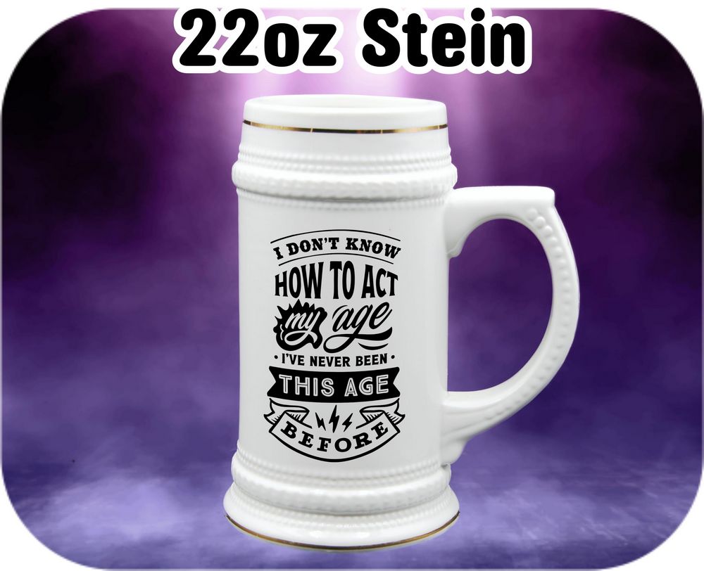Embrace your unique charm with our customizable mug. 🎉 Featuring a hilarious quote “I Don’t Know How To Act my age, I’ve never been this age before” printed on one side, leave the rest to your imagination — add your photos and messages for a truly personal touch. Available in various sizes, from a cozy 11oz coffee mug to a generous 22oz beer stein. Start your day with a smile! 🌟