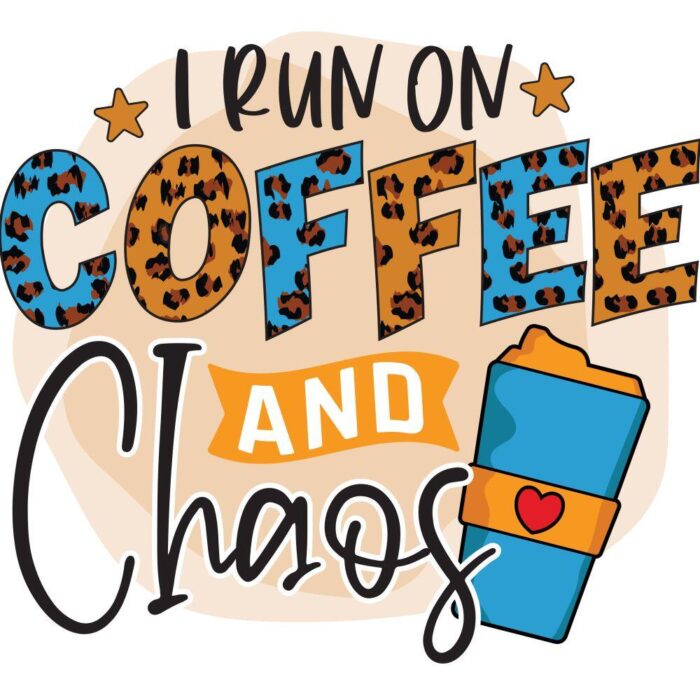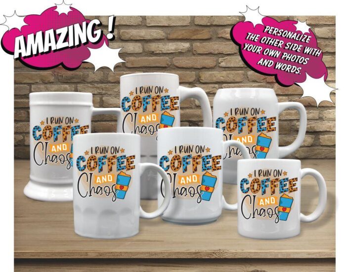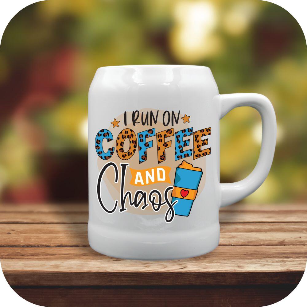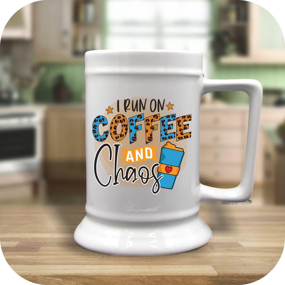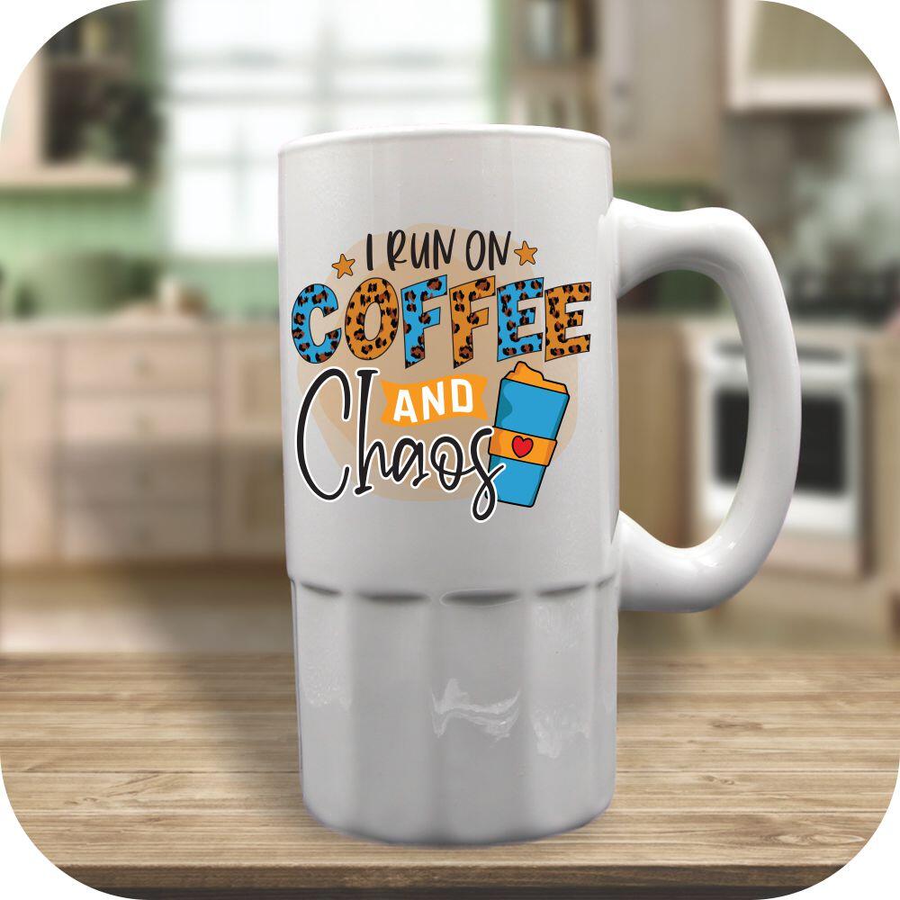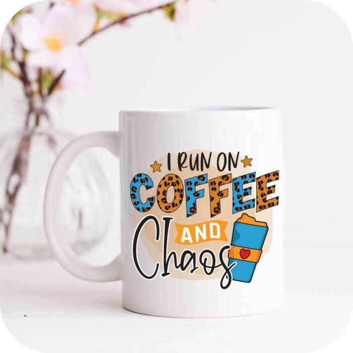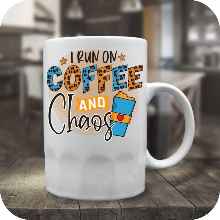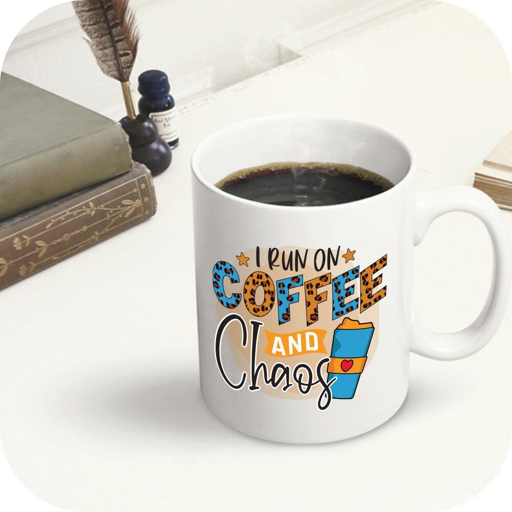 Brighten your morning with a humorous coffee theme mug brightly printed with “I Run On Coffee And Chaos”