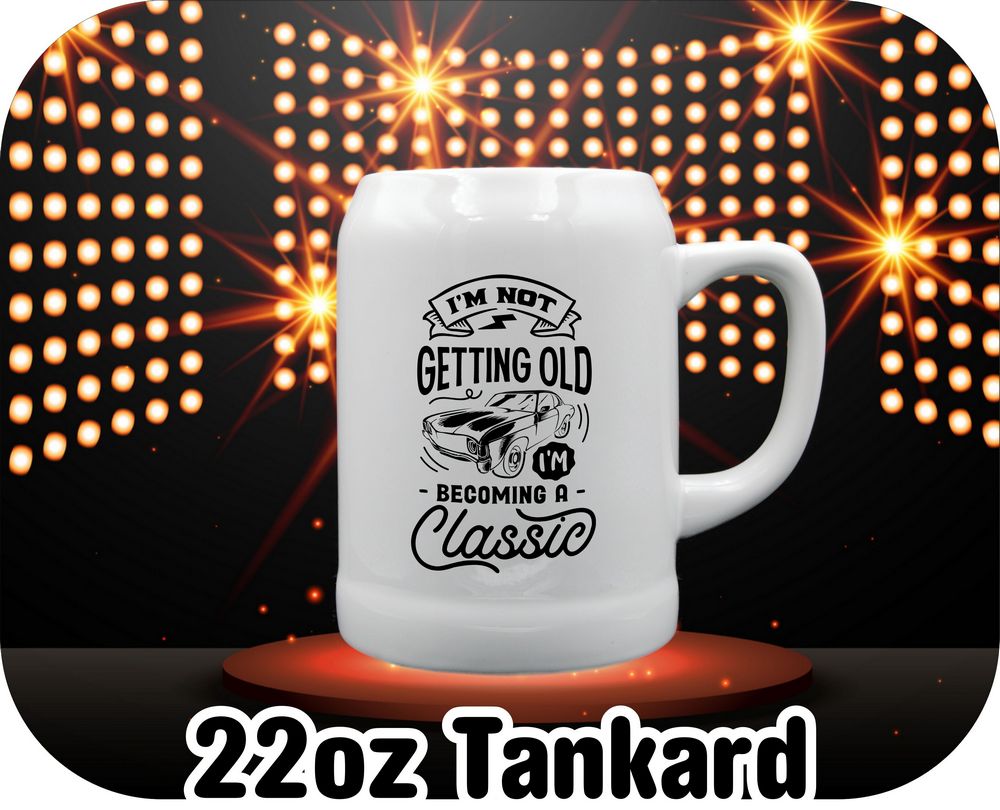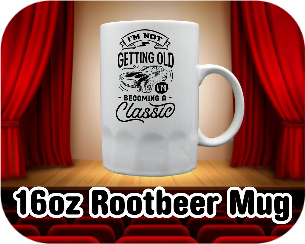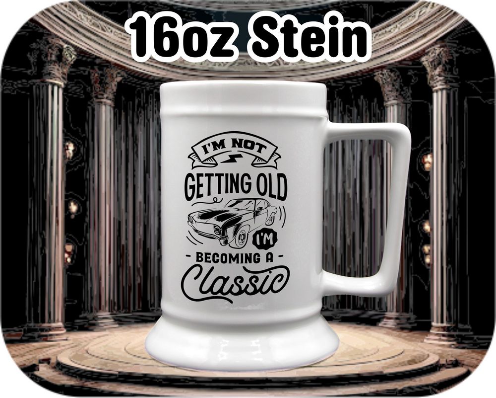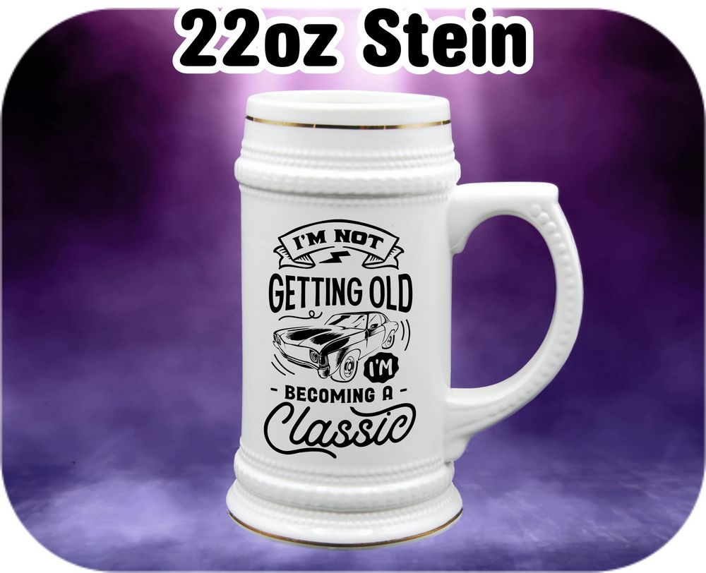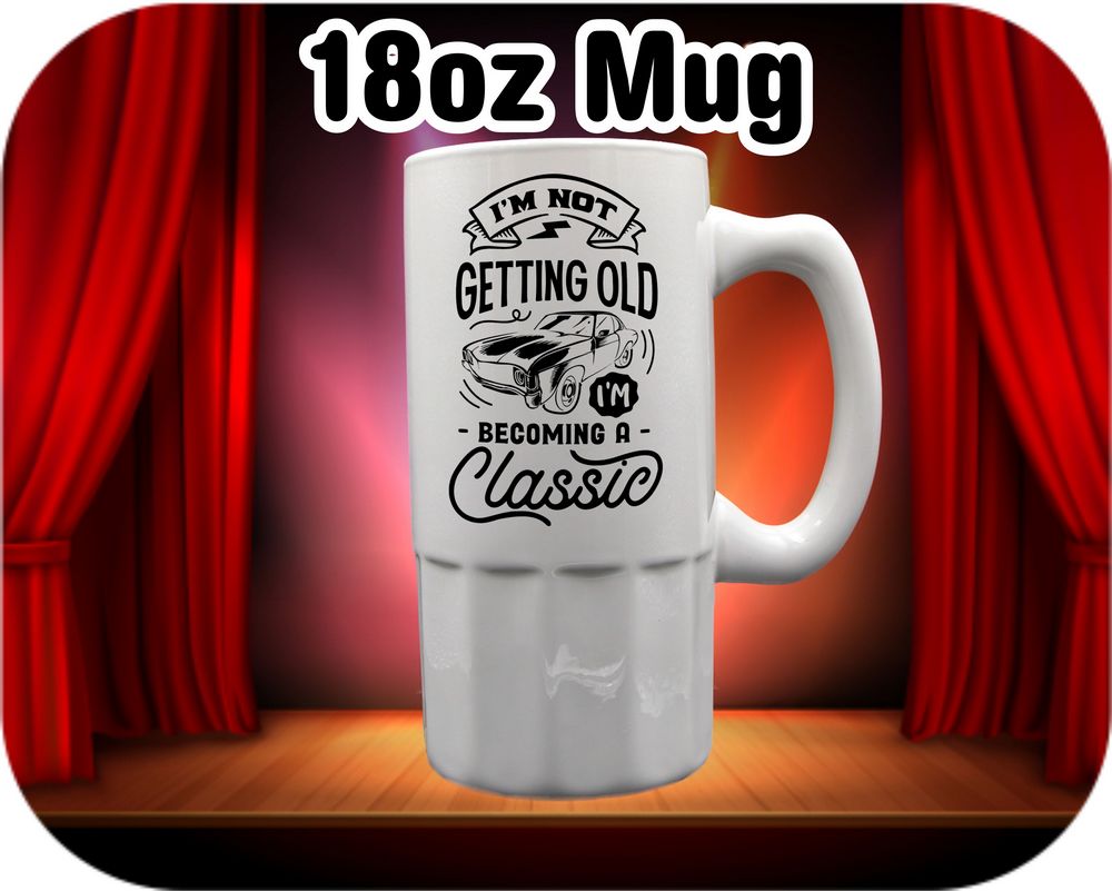 Quirky and timeless, our “I’m Not Getting Old I’m Becoming Classic” coffee mugs add a touch of humor to your morning routine. Choose from different sizes, including 11oz, 15oz, 16oz root beer mug, or 22oz stein, for a personalized touch. Perfect for a chuckle with your coffee or as a fun gift for loved ones. Add a little classic charm to your day!