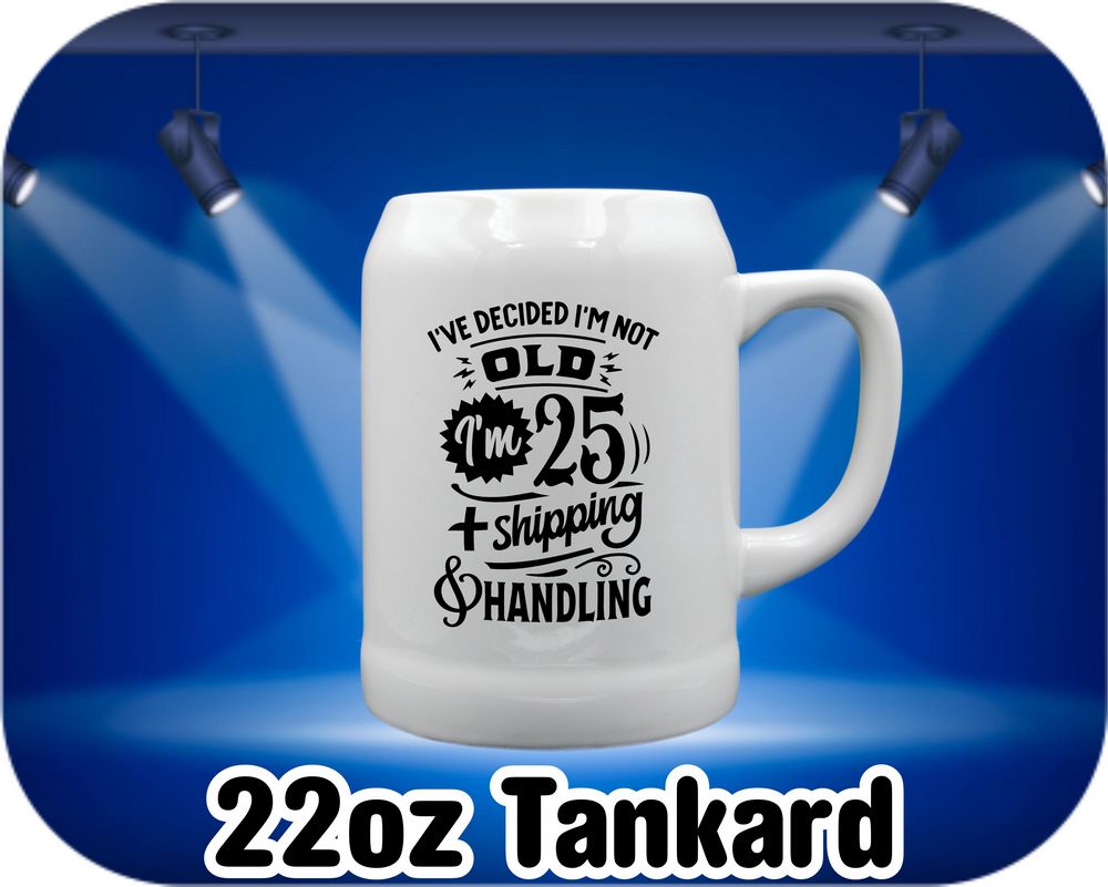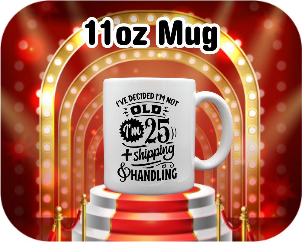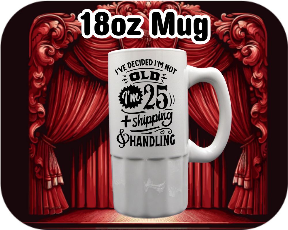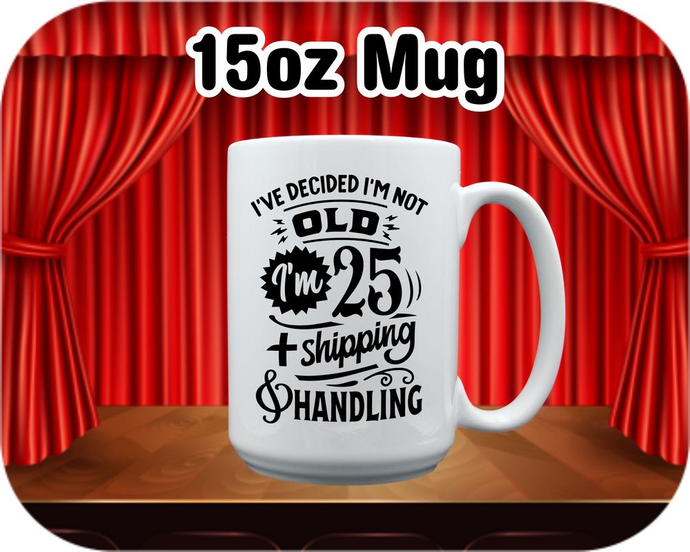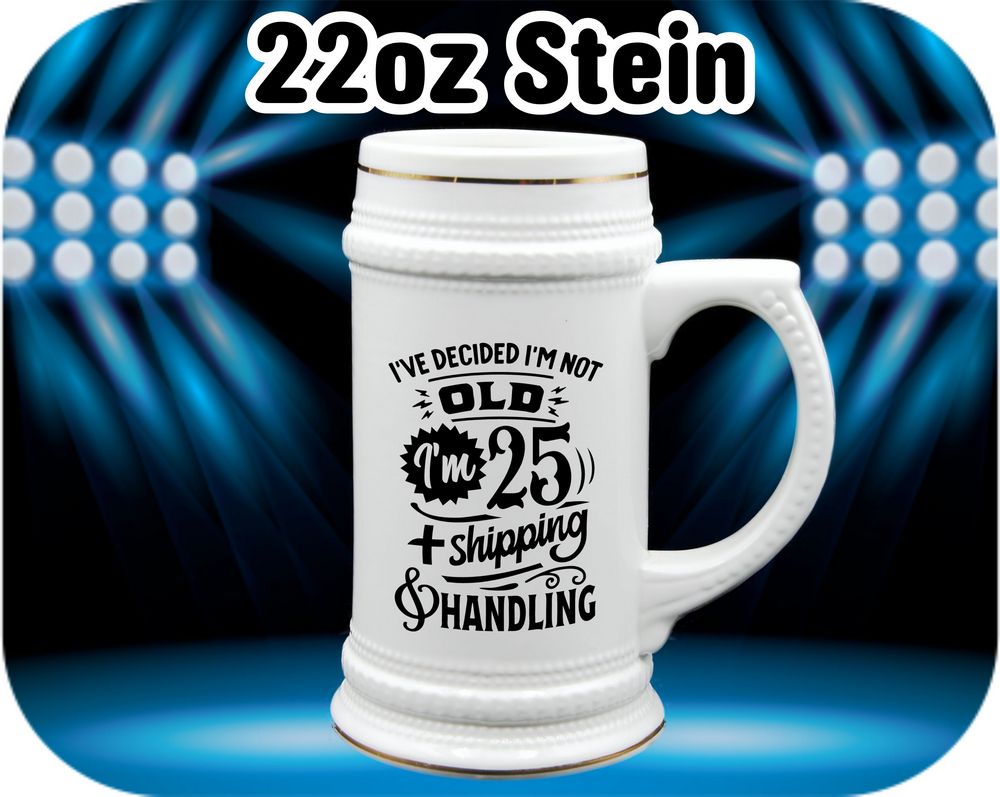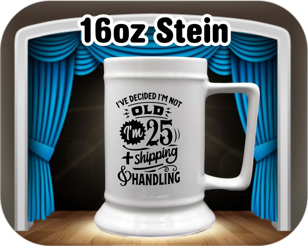 Embrace your age with a touch of humor! Our Funny Ole Person Mugs & Steins are perfect for enjoying your favorite beverages in style. Whether it’s coffee, root beer, or beer, these ceramic cups can be personalized just for you. Printed with the witty quote “I’ve Decided I’m Not Old, I’m 25 plus shipping & Handling”, these mugs are a fun addition to your collection. Choose from 11oz coffee cups or 15oz coffee mugs, and add a playful twist to your drinkware arsenal.