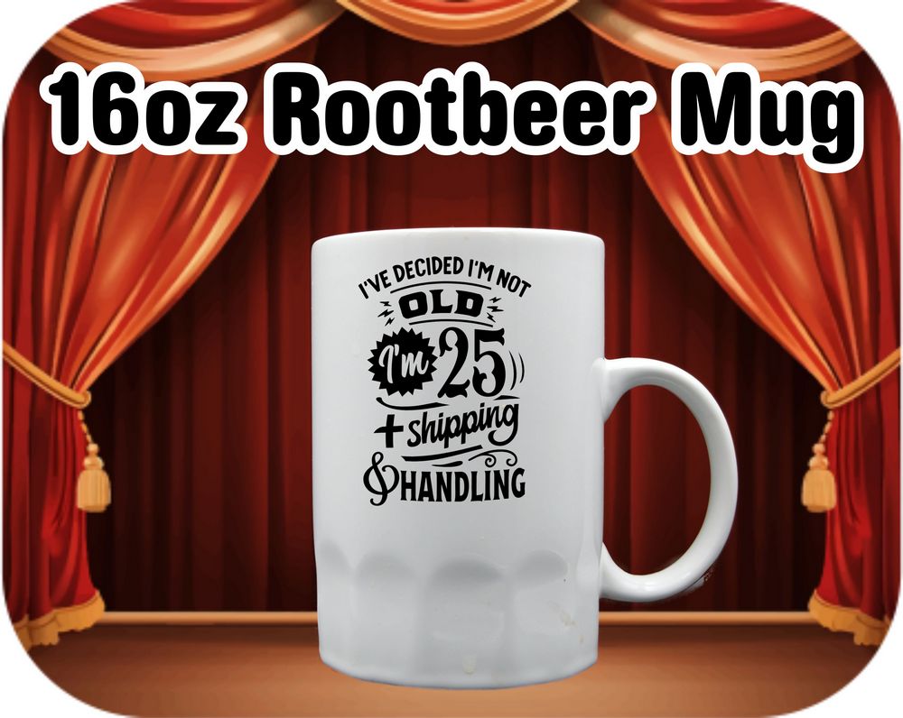 IWho says getting older can’t be fun? Embrace the beauty of aging with our hilarious Funny Ole Person Mugs & Steins! Perfect for your morning coffee or evening brew, these ceramic 11oz and 15oz mugs, root beer mugs, and beer steins are designed to bring a smile to your face. The best part? You can personalize them with your own photo and the witty phrase “I’ve Decided I’m Not Old, I’m 25 plus Shipping & Handling.”