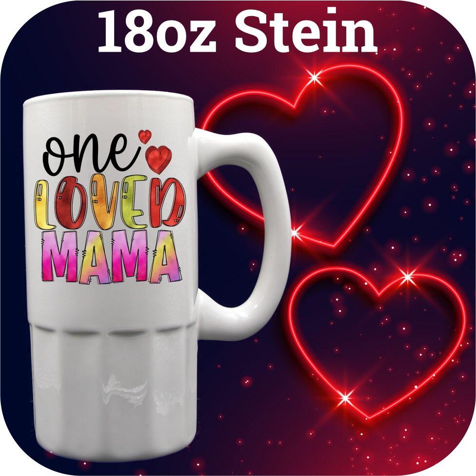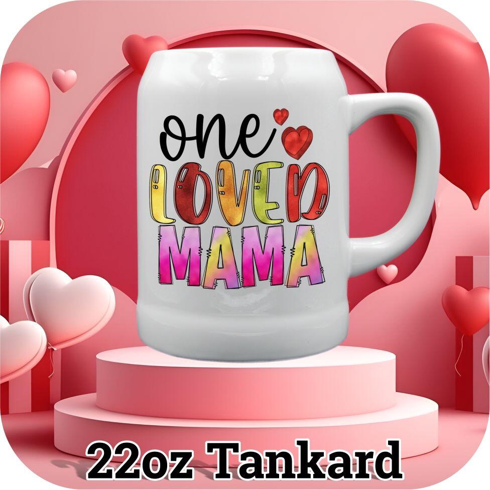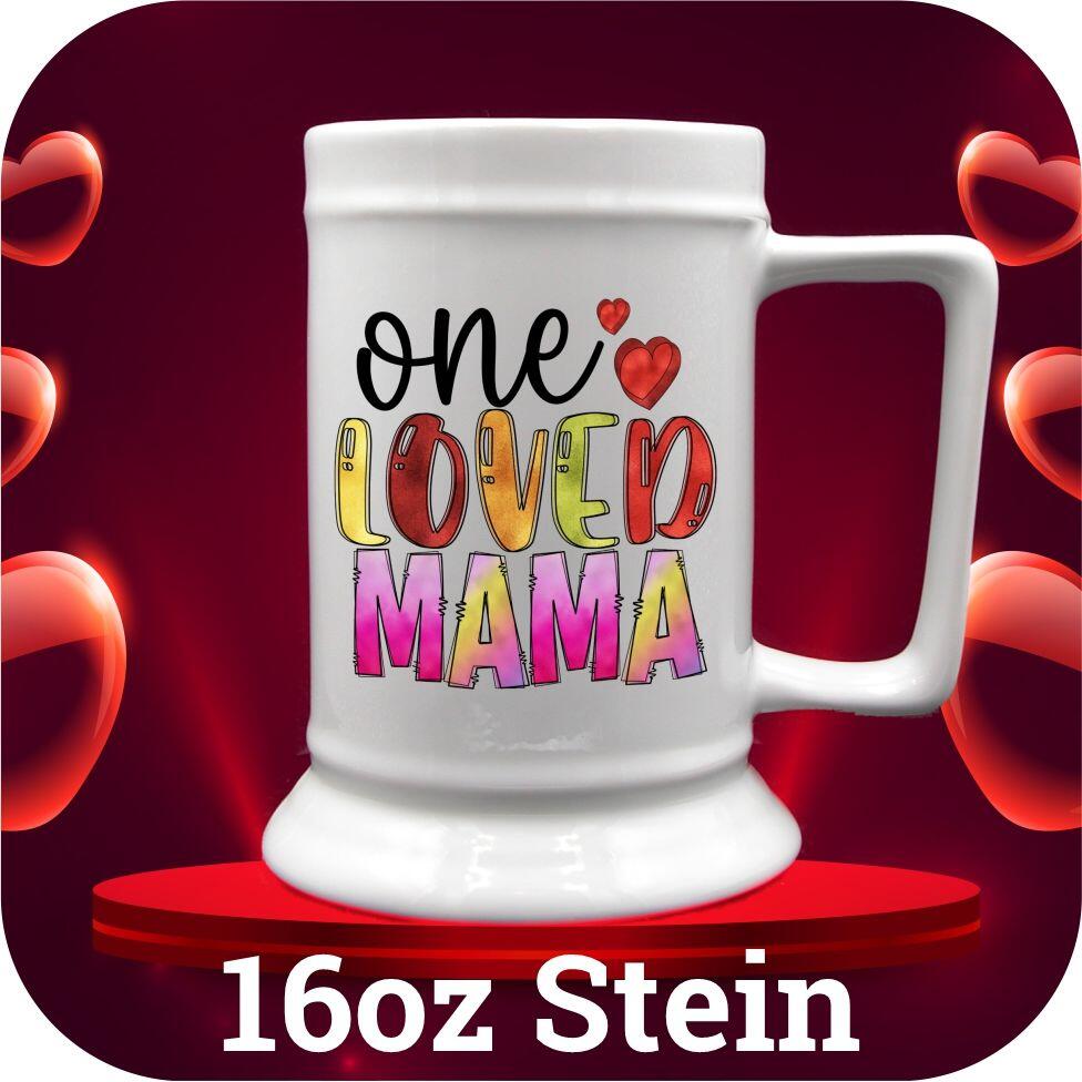 Express your love this Valentine’s Day with our personalized Valentine gift mugs. Available in 11 and 15oz sizes, you can choose between import or USA options. We also offer a 16oz root beer mug, as well as 16, 18, and 22oz steins. Each mug is custom printed with adorable hearts and the quote “One Loved Mama”, along with your own special photo. Make this Valentine’s Day truly special with a unique and heartfelt gift.
