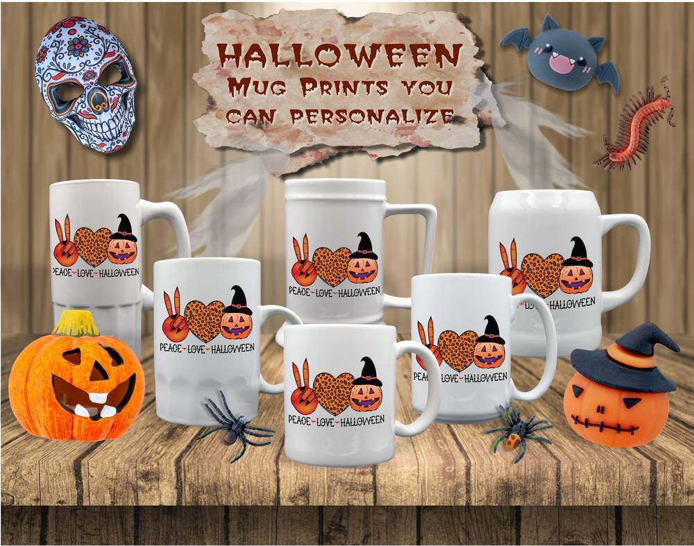 Embrace the spooky season with our personalized Peace Love Halloween Mugs & Steins! Add a touch of customization to your morning brew with these vibrant ceramic mugs. Available in 11oz, 15oz, and stein sizes, perfect for coffee or your favorite brew. Printed with “Peace Love Halloween” to get you into the festive spirit. Make them your own by adding photos, names, or a special message. A fun and unique addition to your Halloween collection!