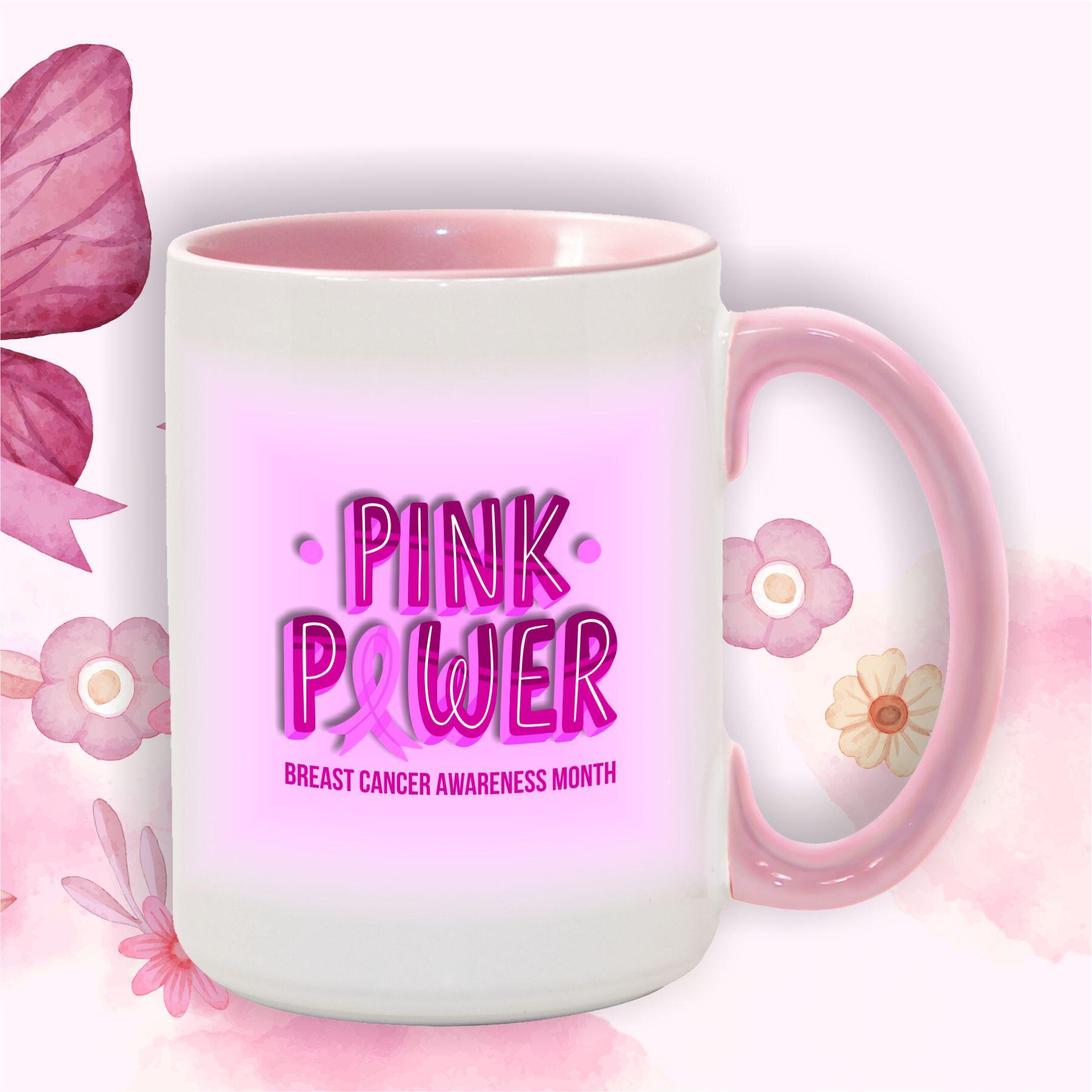Show your support for breast cancer awareness with our Pink Power printed coffee mug. This customizable mug features a pink trim and comes in 11oz and 15oz options.