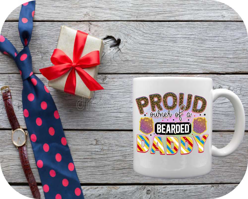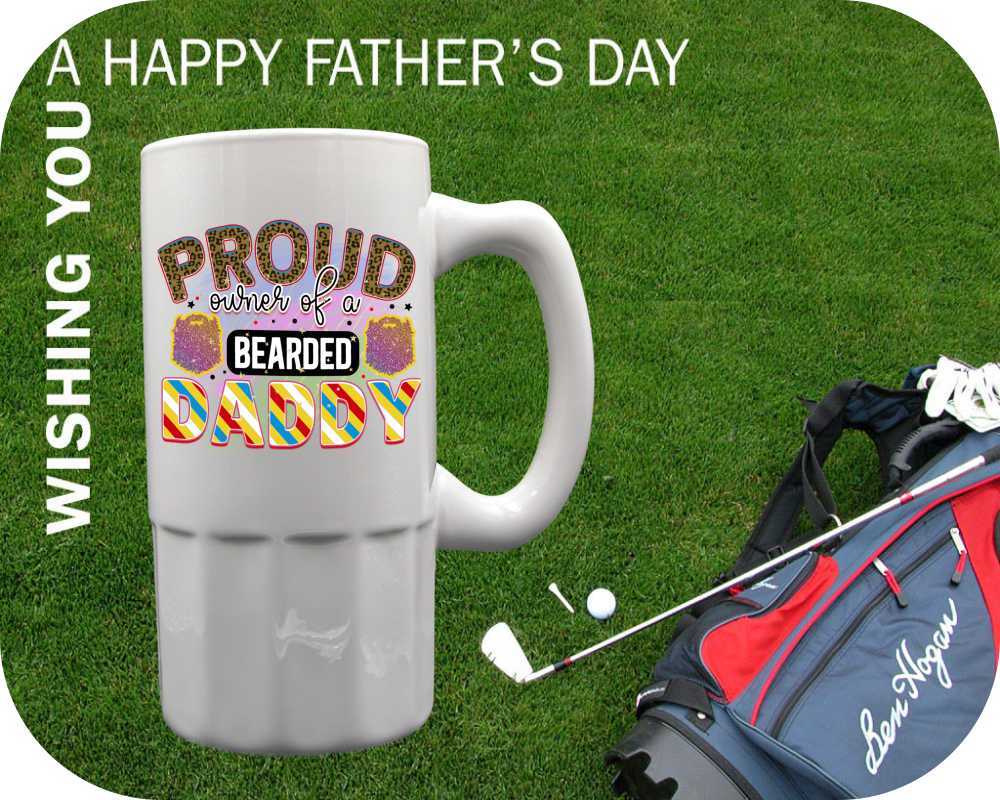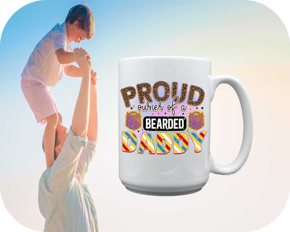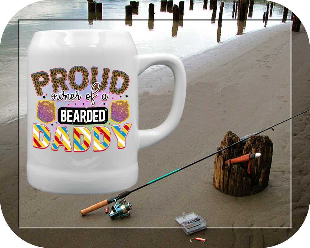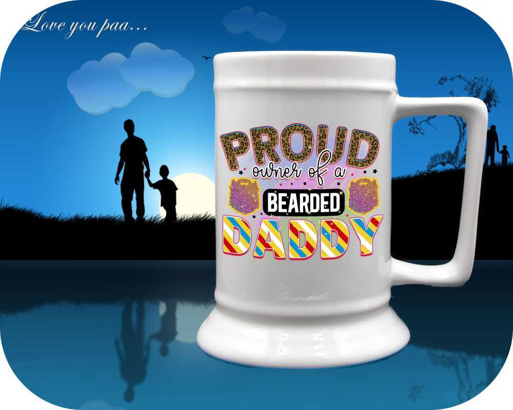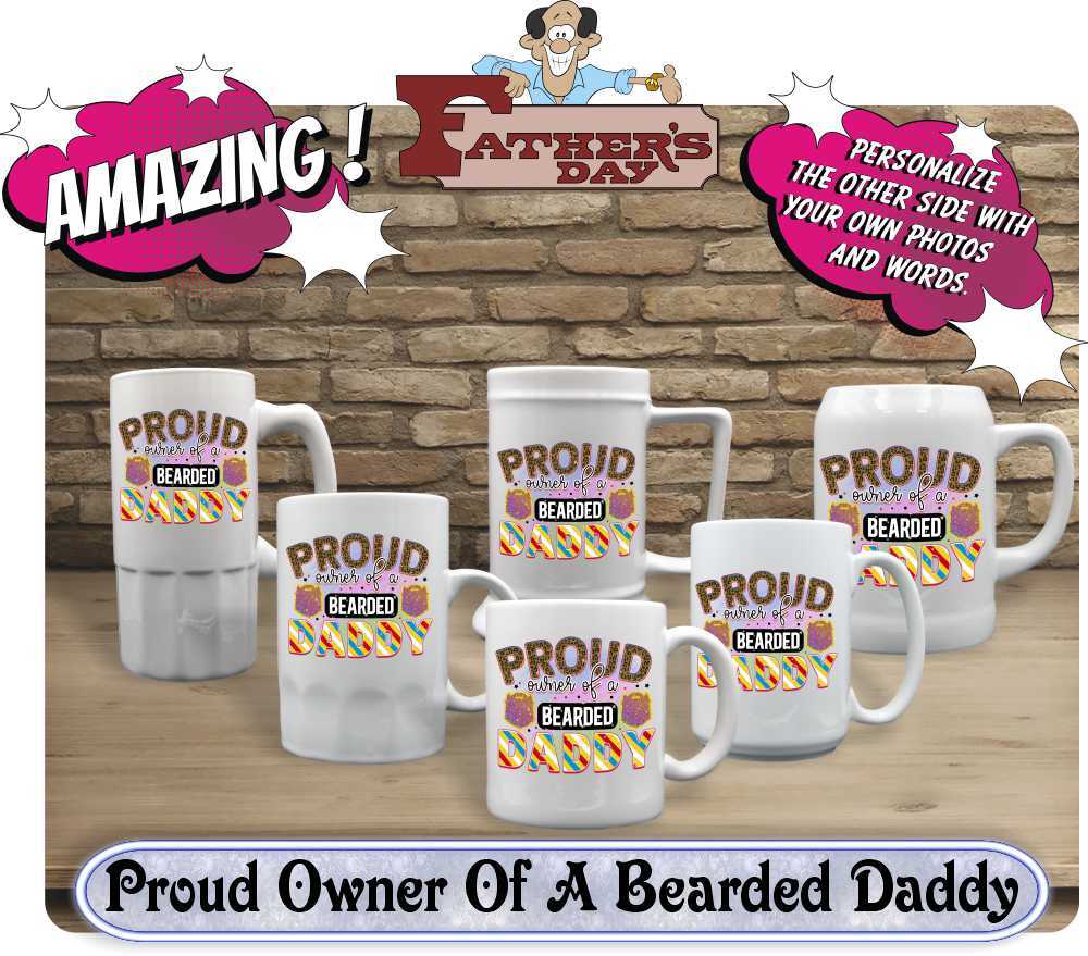 Unleash the dad jokes with our “Proud Owner Of A Bearded Daddy” mugs & steins, exclusively for bearded fathers! Personalize yours with photos, names, and even a child’s handwritten message. Choose from 11oz coffee cups to 22oz tankards in ceramic perfection. A perfect gift for the man who rocks both the baby cradle and the bearded look – add a touch of humor to his daily brew.