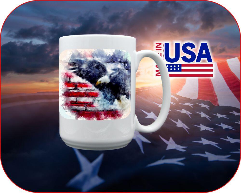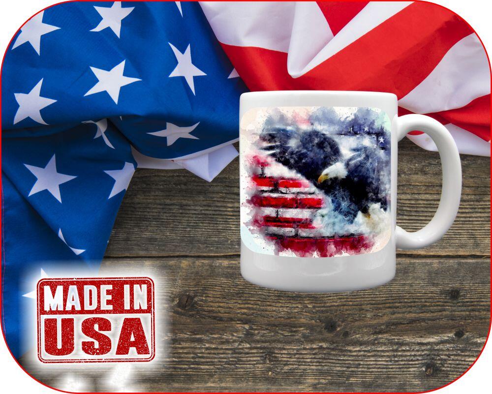 Soft watercolor painted American flag with our bald eagle combines strength and gentle touch to represent United States of America. We will even add your own personal text and photos/images with this print anywhere within the allotted print area of your chosen mug.