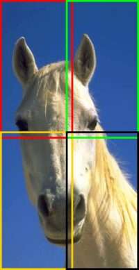 So we will cut each section of the horse into 3.25″ x 6.25″. We don’t want to enlarge the image to accommodate added space, the extra space needs to bleed into the extra space of the adjacent tile prints. Each of the colored boxes over the picture would be 3.25″ x 6.25″ and show where the image will be sliced. The overlap of the red and green (and the others) is the 1/4″ overlap needed. This gives a smooth transition from one tile to the next.
